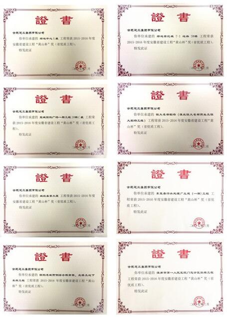 我单位从安徽省住房和城乡建设厅获悉,安徽省建设工程“黄山杯”奖(省优质工程)获奖名单出炉,由合肥建工集团承建的绿地中心A座、宣城国购广场一期工程1#楼C座、城改盛景大厦、国购名城西侧综合南楼、北楼及地下车库、绿地世纪城7-1地块3#楼、恒大名都剧场、东至县污水处理厂土建(一期)、淮南市第一人民医院门急诊医技楼八项工程荣获2015-2016年度安徽省建设工程“黄山杯”奖。此次合肥建工获奖数量之多,在安徽省建筑业内名列前茅。